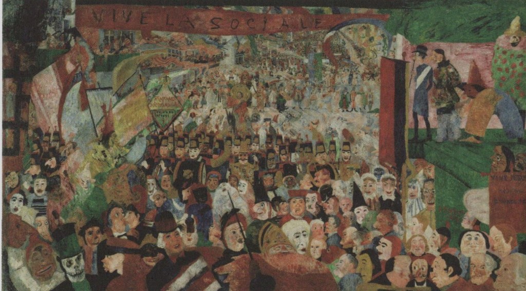 Ce qui, au premier regard, apparaît comme une immense bouffonnerie réitère la présence des traditions carnavalesques dans maintes autres œuvres du précurseur de l’expressionnisme. Mais ses masques ne sont pas à la fête: sous ses pinceaux, ils deviennent des êtres humains grotesques, ou scandalisés, ou étonnés, ou terrifiés… Avec les têtes de mort, ils font bon ménage. Quant au message, en dépit du titre sans doute emprunté à Balzac (Jésus-Christ en Flandre, 1846), il n’a plus rien d’une parabole religieuse. Au cours du temps, Ensor a fait disparaître du tableau, resté en sa possession jusqu’à son décès, certaines annotations originales, dont « Vive Anseele et Jésus » et « Mouvement flamand Hip Hip Hip Hourra! » (p. 75) (Edouard Anseele, homme politique gantois, a été un des pères fondateurs du socialisme belge). Est demeuré en revanche un « Vive la sociale » sur fond rouge, en haut et en grand. Comme un deuxième titre, autrement séditieux que le premier ? Sans effet négatif pour l’auteur: les riches acquéreurs qui aiment les révolutionnaires sont légion.