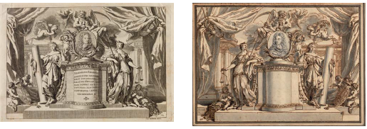 Pour Grondoni comme pour beaucoup d’autres compagnons ou maîtres du métier, l’exécution et la vente de gravures ont constitué une source de revenus complémentaires, voire un métier de substitution. Notre personnage en a ainsi publié deux séries: les Principÿ per l’arte de gli orefeci (1709), composés de six gravures en plus de la page de garde, avec un accent sur l’ornementation florale, et l’Aulæ Bavariæ Magnificentia (1715), dédiée à l’électeur Maximilien Emmanuel de Bavière, protecteur de nombreux artistes à l’époque, comportant en particulier dix gravures où le diamant est surtout mis en valeur. Adressées notamment aux confrères qui peuvent y trouver des modèles, ces planches deviendront, à partir du début du XIXe siècle, des œuvres prisées, atterrissant dans maintes collections privées et publiques en Allemagne, en France, au Royaume-Uni… et jusqu’au Metropolitan Museum of Art à New York. Pourtant, l’originalité des objets représentés doit être relativisée. Certains, importés ou de seconde main, ont été monnayés. S’inspirer de motifs antérieurs est alors pratique courante et Jean Baptiste ne fait pas exception. Selon Wim Nys, il a notamment puisé dans le Goldtschmidts Büchlein de Johann Wilhelm Heel (Nuremberg, après 1668), Ein neues Buch von allerhand Gold-Arbeit de David Baumann (Augsbourg, 1695), le Livre de taille d’epargne de gout ancien et moderne de Jean Bourguet (Paris, 1702) ou encore les Essais de gravures de Pierre Bourdon (Paris, 1703).