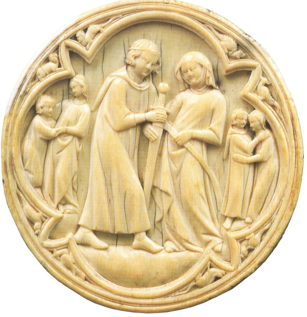 Cette valve de miroir du XIVe siècle illustre une rencontre amoureuse qui s’accompagne, de la part de l’homme, du renoncement à l’épée. (Source: Musées royaux d’art et d’histoire, Bruxelles, dans Régine Pernoud, « La femme au temps des cathédrales » (1980), rééd., Paris, Stock-Pernoud, 2001, p. 110).