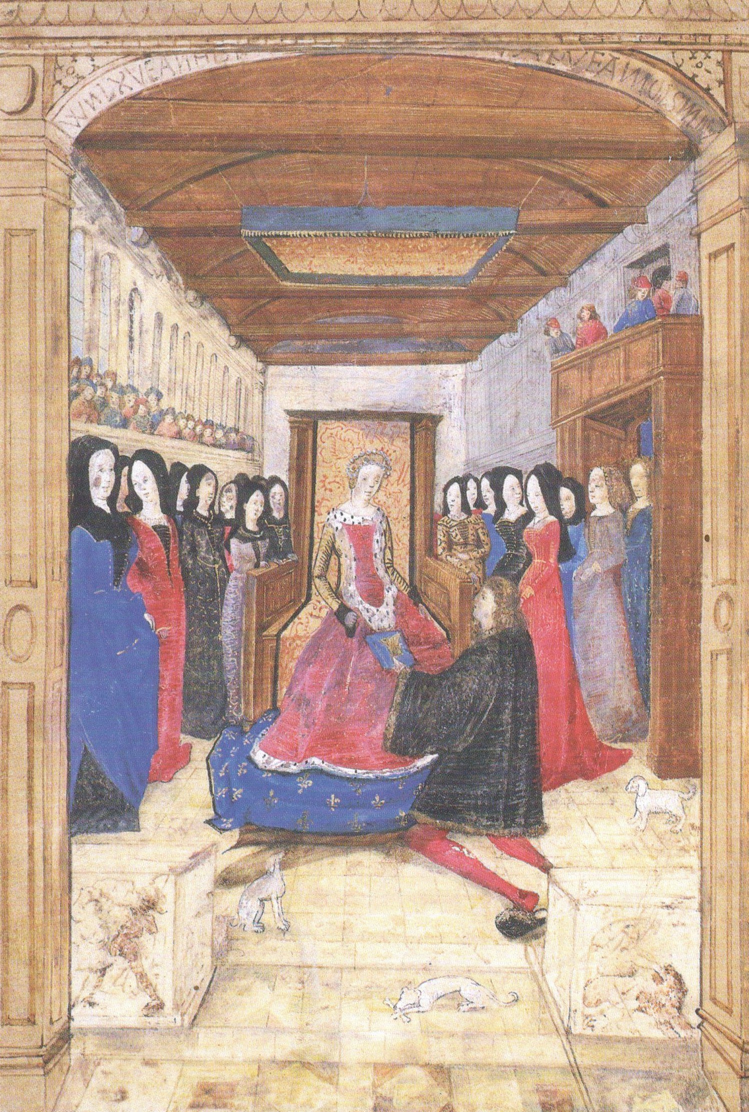 Marie de Bourgogne reçoit vers 1480 le « Mirouer aux dames » , livre consacré à des figures féminines exemplaires, des mains de son auteur Philippe Bouton. La jeune duchesse est assise sur son trône dans la grande salle du palais, entourée des femmes de sa suite. A l’exception du poète, les hommes sont tous relégués dans les tribunes. (Source: Bibliothèque municipale, Dijon, Ms 3463, f. 1 v°, dans Régine Pernoud, « op. cit. » , p. 230)