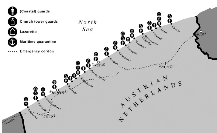 Si les autorités communales sont évidemment en première ligne, le poids du gouvernement central ne cesse de s’accroître, ici comme tous les domaines au cours de l’époque moderne. Il se traduit par le passage d’un management de crise, encore prévalent dans la première moitié du XVIIIe siècle, à des dispositions plus permanentes pour contrer les menaces représentées par la peste mais aussi par la fièvre jaune. En 1720, des lazarets en bois sont improvisés dans les dunes pour les sujets qui doivent subir la quarantaine onshore. En 1770, on a été plus prévoyant. Des infrastructures prophylactiques ont été mises sur pied par décision du Conseil privé, qui seconde le gouverneur général des Pays-Bas, et les gardes côtiers en ont reçu des directives précises. « C’est la première fois, constatent les Etats de Flandre, que les précautions sur les côtes ont été établis en regle et que l’on a préscrit des directions à cet égard, ci-devant l’on s’est contenté de charger en general ceux du Franc de Bruges (une subdivision du comté) de faire veiller sur les côtes de leur ressort » . Bruxelles entend être informée de tout ce qui survient dans les ports et favorise par ailleurs l’usage des « certificats de santé » caractéristique, avec les lazarets et la tendance à généraliser les pratiques d’isolement temporaire, du modèle méditerranéen.
