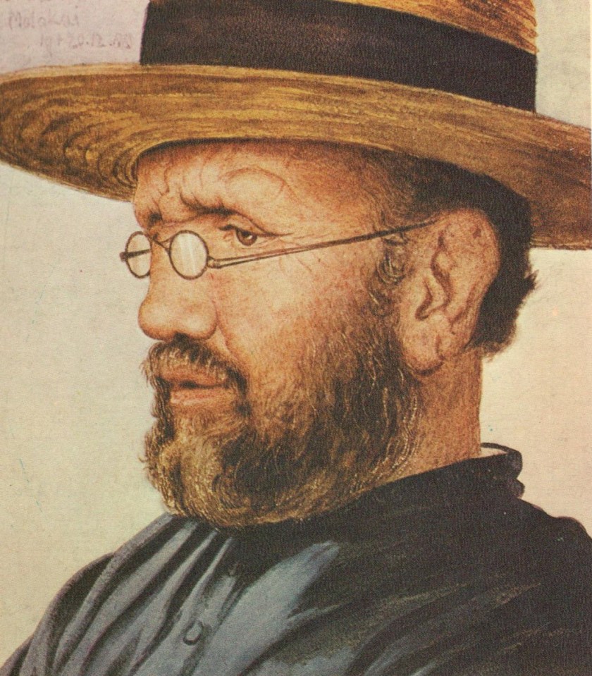 Jozef De Veuster, en religion le père Damien, a sa statue au Capitole de Washington, mais pas de fenêtre dans le « Canon van Vlaanderen » . (Source: éd. Clifford, Molokai (Hawaii), 1888, dans Gavan Daws, « Nous autres lépreux. Le père Damien de Molokai (1840-1889) » (1973), trad. de l’anglais, Paris, Nouvelle Cité, 1984, couverture)