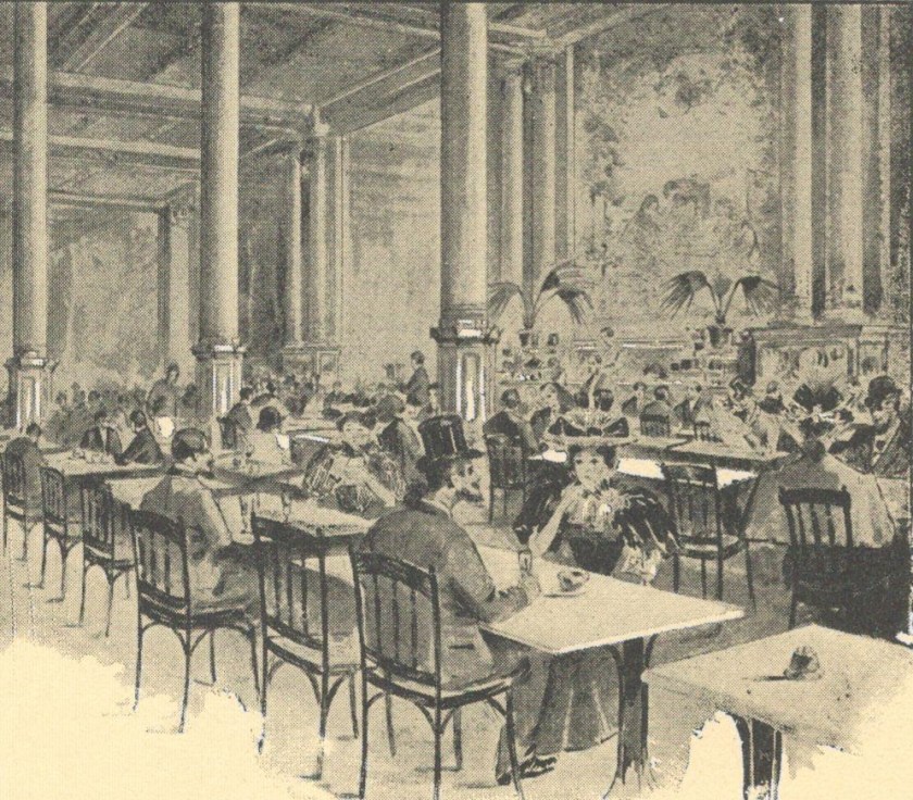 L’éclairage électrique, en revanche, s’avère bien présent, fréquemment avec des abat-jour au cachet Art nouveau. Les robinets distributeurs de boissons sont aussi largement diffusés. Repérables même aux Floralies qui ne comptent que trois petites tables, ils répondent à ce qu’Alphonse Barrez, secrétaire de l’Association des décorateurs et ensembliers modernistes, désigne comme le « goût populaire pour les choses scintillantes » . A côté des chaises en bois classiques, d’autres plus « tendance » , galbées et en hêtre (style viennois) ont fait leur apparition dès la Belle Epoque. Elles peuvent coexister avec les antiques banquettes fixées au long d’un ou plusieurs murs.