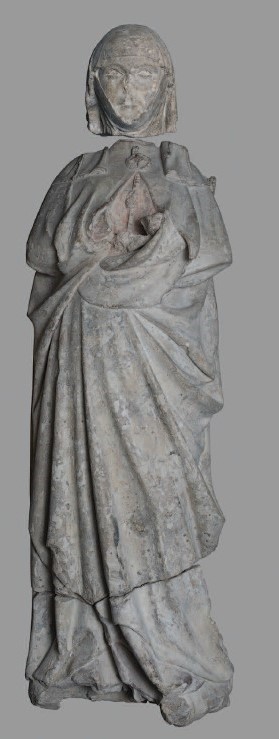 La solution est compatible avec certains détails de la statue féminine qui témoignent d’une opulence, comme la belle broche orfévrée maintenant les deux pans de son mantel ou la présence à ses pieds de ce qui semble avoir été deux chiens accroupis. Un habit profane ? Par allusion peut-être au statut de « béate » , soit de religieuse ne vivant pas dans la clôture, qui fut le plus longtemps celui de la fondatrice. Par ailleurs, une longue historiographie tient pour acquis, selon les termes d’Henri d’Outreman dans son Histoire de la ville et comté de Valentiennes (1639), que la comtesse de Luxembourg a « fondé à ses fraix ce couvent au lieu propre de sa nativité, où aussi après sa mort elle a mérité d’avoir sépulture » . Le Boucq signale pour sa part que « cette princesse gist au meillieu du chœur des Dames, où parcidevant se voyoit sa tombe fort magnificquement relevée, et pardesus sa représentation en allebastre, ayant son manteau semé des armes de l’Empire, Lutzembourg et Avesnes, et sur sa robe celles de Couchy, Dreux et Utrecht » .