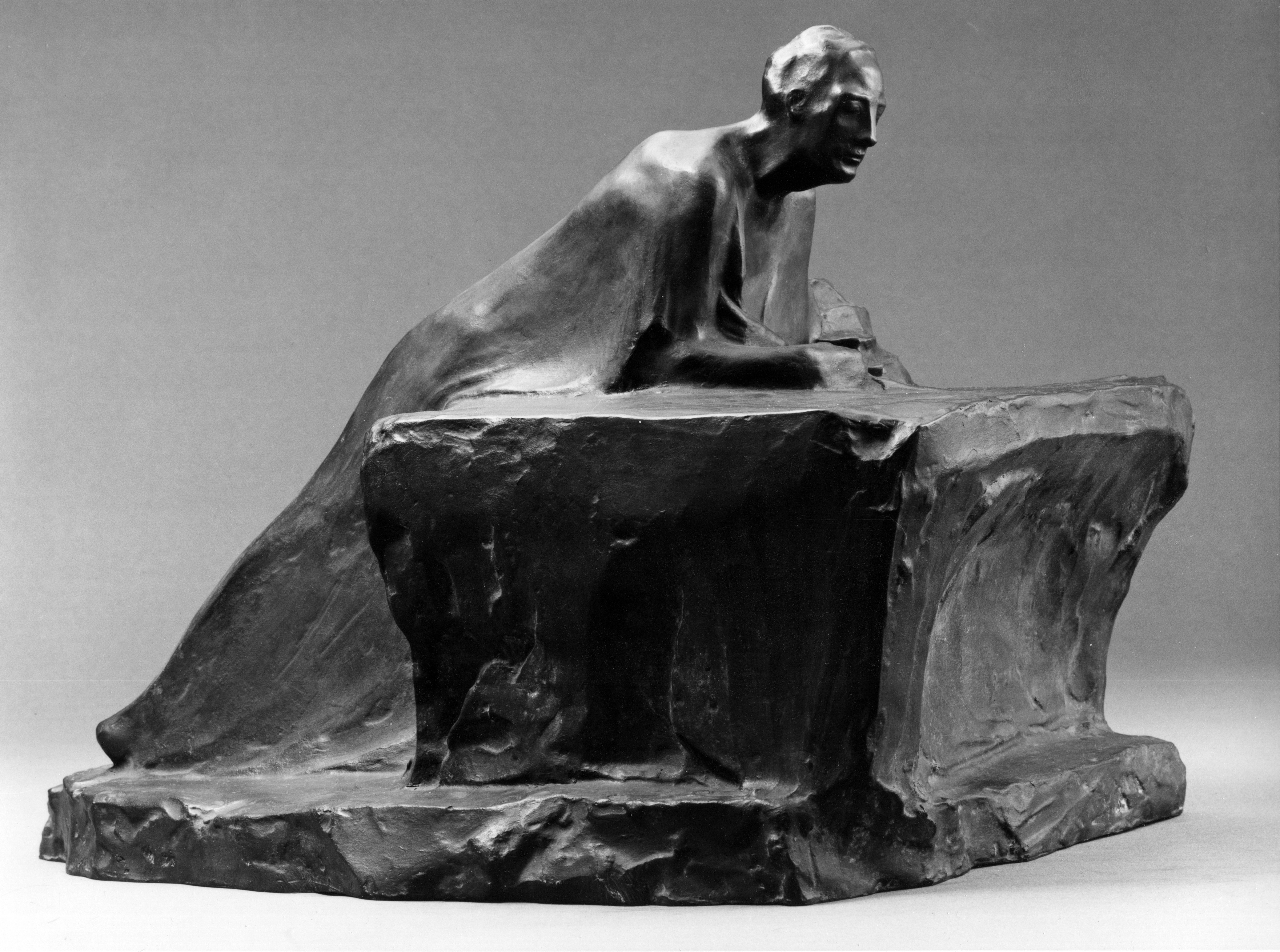 Va donc pour un cher maître. Mais pourquoi cette position inclinée, ce repos sur un bloc ? Quand un Léon Sarteel, concitoyen et contemporain de George Minne avec lequel il présente beaucoup de points communs, sculpte un Redenaar (1906), celui-ci est en pleine plaidoirie, droit devant son public et aussi sûr de lui que le sujet de Minne paraît humble, saisi avant l’action, les pieds en position dans l’attente du départ. On pourra certes lier ces constats à la psychologie d’un créateur resté toute sa vie introverti et misanthrope. « Sa nature personnelle explique le style spirituel qui se trouve dissimulé dans son art, souligne Chiara Logghe. Minne tend toujours à atteindre le monde spirituel, intérieur, par lequel ses œuvres renferment un sens profond » .