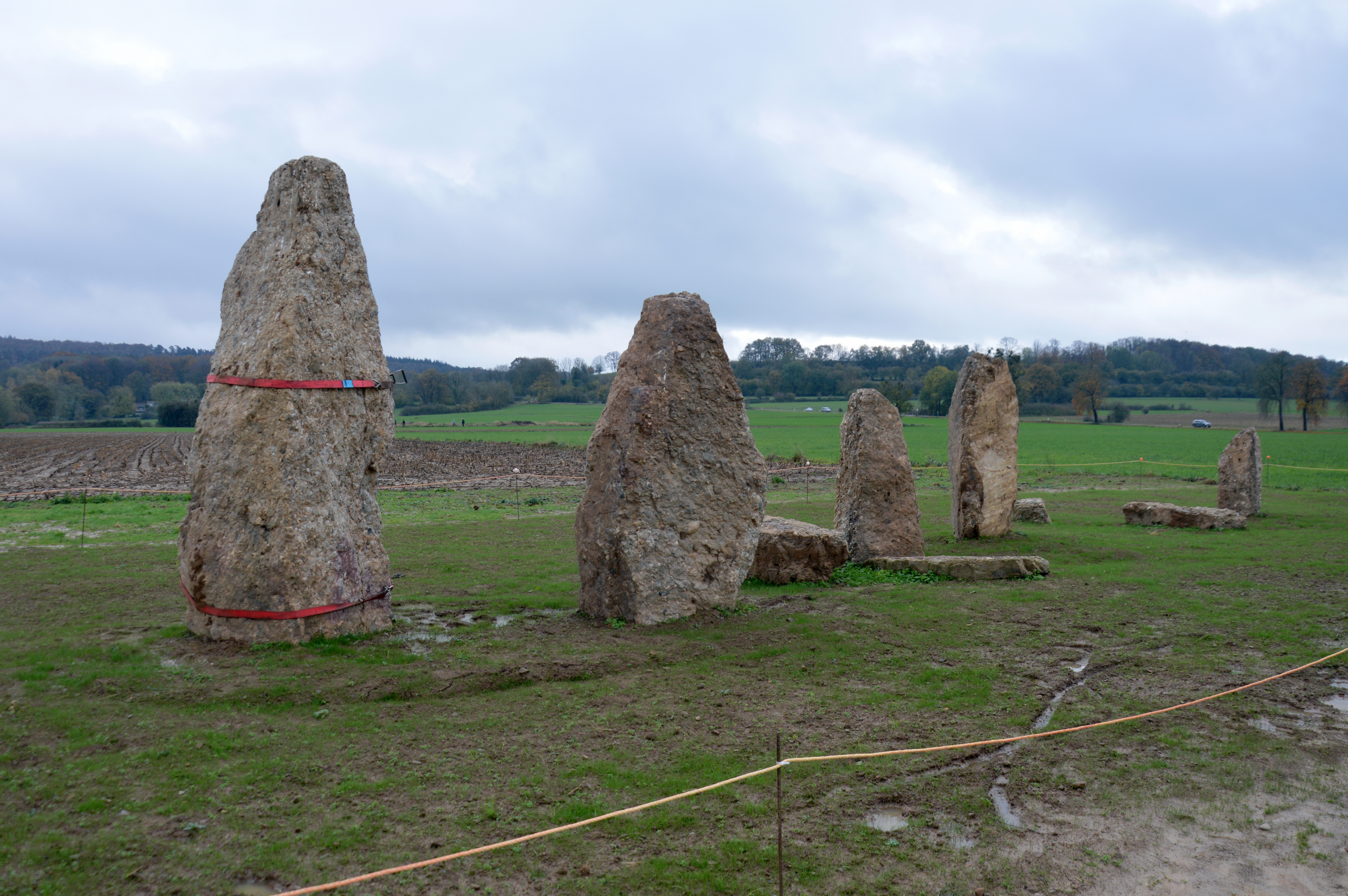 Commencées par une tranchée de diagnostic, qui a permis de localiser l’amorce d’une première fosse, poursuivies par un décapage extensif (635 m²), les fouilles menées entre 2019 et 2023 ont débouché sur la découverte de sept menhirs supplémentaires ainsi que de la fosse de fondation d’un huitième, disparu. La quantité récoltée de blocs de poudingue, le matériau préféré des « Obélix » de Wéris – qui ont dû le puiser à au moins un kilomètre de distance –, atteint un poids total de près de 32 tonnes. Les monolithes en constituent l’essentiel, le reste étant fait de petits blocs où apparaissent des traces de cassures intentionnelles.