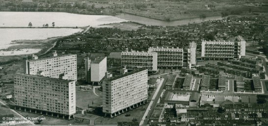 Tout commence dans le contexte de la reconstruction qui suit la Seconde Guerre mondiale ainsi que de l’émergence de l’Etat provindence. Les initiatives anversoises profitent alors des ressources octroyées en vertu de la loi Brunfaut, votée en 1949 comme réponse socialiste à une autre loi, sociale-chrétienne celle-là, la loi De Taeye datée de l’année précédente. Cette dernière avait été conçue pour venir en aide financière aux Belges, nombreux comme on le sait, qui ont « une brique dans le ventre » . La préférence allait donc au développement de maisons particulières hors des villes. Avec Brunfaut, changement de cap: il faut impulser l’érection d’immeubles à appartements dans et autour des grands centres urbains.