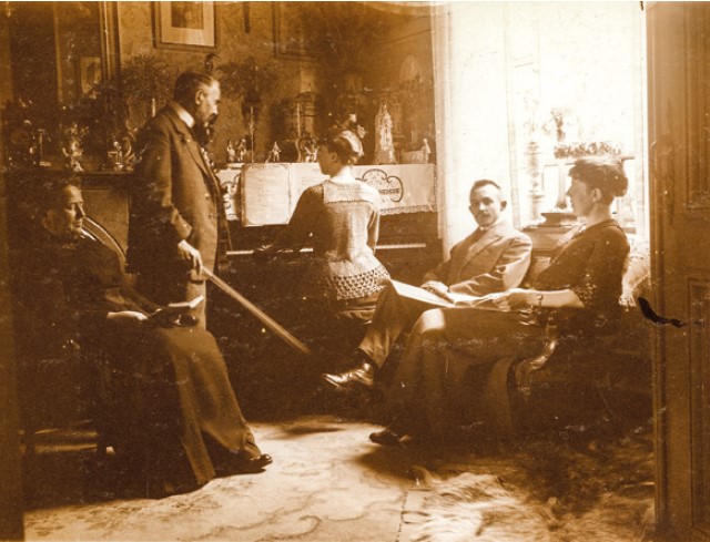 La famille Favette-Sante photographiée dans son salon à Liège vers 1910-1915. Ses meubles d’assise en acajou ou en palissandre de style Louis-Philippe étaient déjà considérés comme démodés depuis les années 1860 (5ource: collection privée, dans n. 1, p. 42).