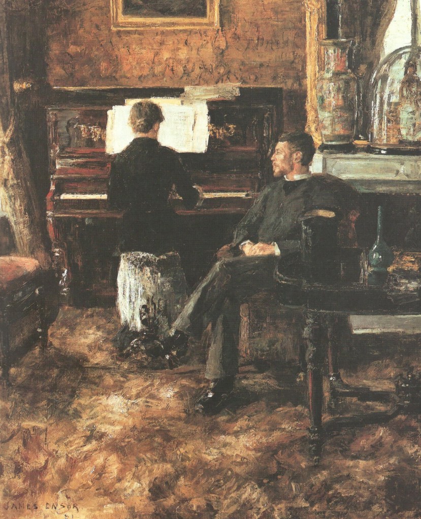James Ensor a laissé plusieurs tableaux de salons bourgeois. Celui-ci est daté de 1881 et intitulé « La musique russe » . (Source: musées royaux des Beaux-Arts de Belgique, Bruxelles, inv. 4679, dans « Du réalisme au symbolisme. L’avant-garde belge 1880-1900 » , dir. MaryAnne Stevens & Robert Hoozee, Bruges, Fondation Saint-Jean, 1995, p. 103)