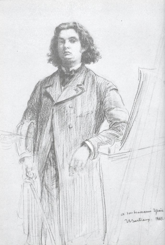 Eugène Ysaÿe dessiné par Berteaux (Hippolyte ?) en 1885, avec une dédicace à Guillaume Lekeu. (Source: Bibliothque royale de Belgique, Mus. Obj. 368, détail; n. 1, p. 36)